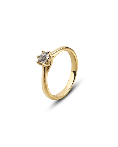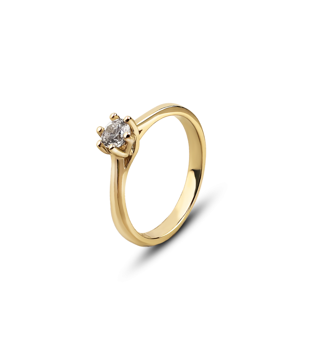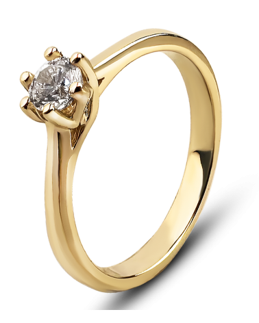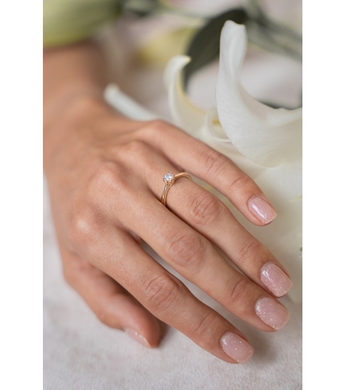 Piękny złoty pierścionek zaręczynowy Rosa. Oprawa podtrzymująca kamień została wykonana na wzór kwiatu róży.