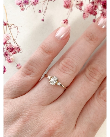 Piękny, złoty pierścionek zaręczynowy Allesia. Oprawka, w której osadzone są trzy kamienie, została wykonana na wzór diademu.