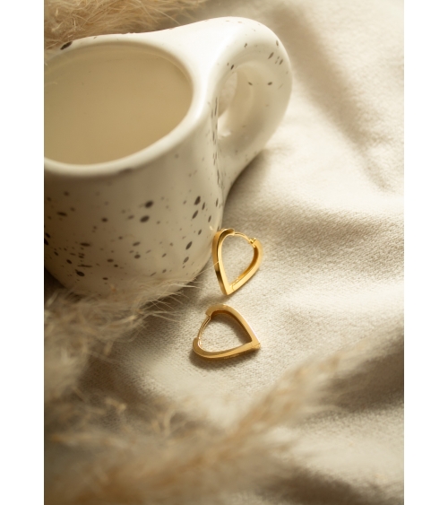 Wykonane są ze złota, które nadaje im luksusowego charakteru. Ich kształt przypomina delikatnie zaokrągloną łzę lub odwrócone serce, co dodaje im subtelnej oryginalności i kobiecego uroku. Są grubsze na zewnętrznych krawędziach, co podkreśla ich solidność i styl, a jednocześnie zachowują lekkość formy.