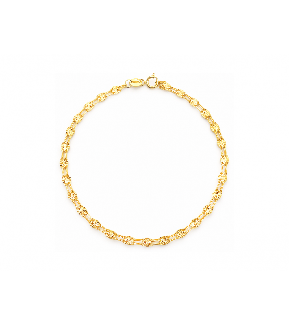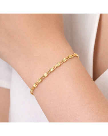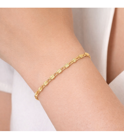 Bransoletka Sunshine to subtelna, a zarazem efektowna propozycja dla kobiet ceniących delikatną elegancję i blask złota – jej smukła szerokość 3,2 mm pięknie układa się na nadgarstku, a dekoracyjne, diamentowane ogniwa w kształcie promienistych rozetek przywodzą na myśl ciepłe promienie słońca, nadając całości lekkości i wyjątkowego połysku.