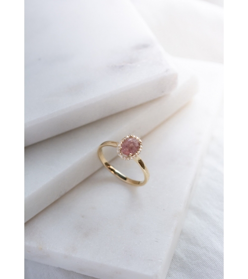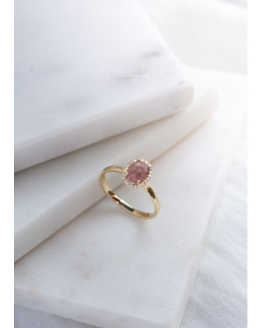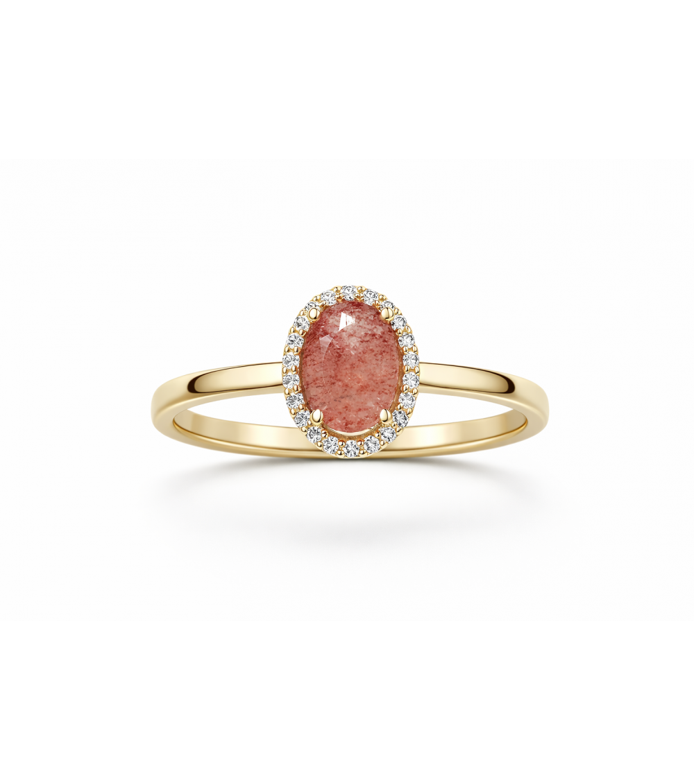 Pierścionek wykonany jest z żółtego złota o ciepłym, klasycznym odcieniu, które subtelnie podkreśla jego elegancki charakter. Centralnym punktem jest owalny kwarc truskawkowy w odcieniu różowo-łososiowym, wyróżniający się naturalnymi inkluzjami przypominającymi drobne ziarenka, które nadają mu unikalny wygląd. Kamień został osadzony w czterech złotych łapkach, co pozwala na maksymalne doświetlenie i wyeksponowanie jego struktury.