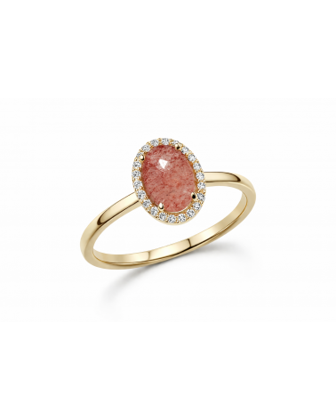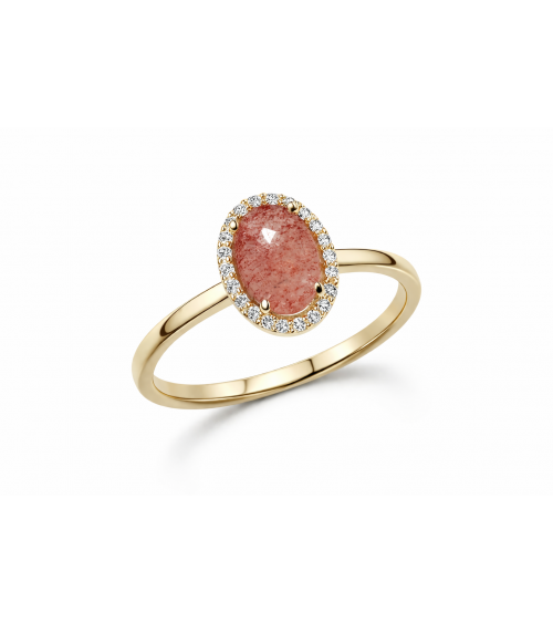 ZŁOTY PIERŚCIONEK Z KWARCEM TRUSKAWKOWYM I MOISSANITAMI 0.11CT