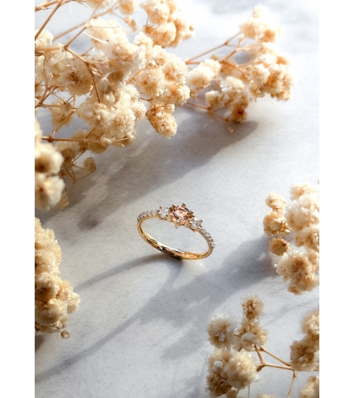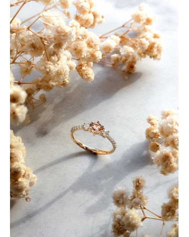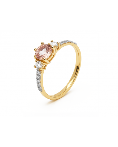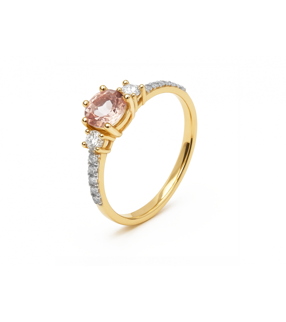 Elegancki pierścionek wykonany z żółtego złota zachwyca subtelnym i romantycznym designem. W centralnej części oprawiono okrągły morganit o delikatnym, brzoskwiniowo-różowym odcieniu, który przyciąga wzrok swoją miękką barwą i blaskiem.